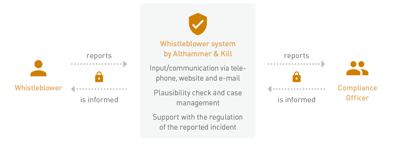 Althammer & Kill GmbH & Co. KG provides the whistleblower system for the responsible organization as a processor. It is a compliance consulting company operating nationwide. The employees ensure that the protection of the whistleblower is guaranteed.